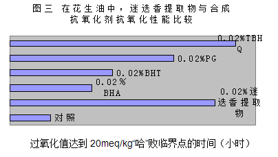 各類合成抗氧化劑與迷迭香抗氧化劑在植物油脂中使用比較,,它們抗氧化性能的順序為:TBHQ>迷迭香提取物>PG>BHT>BHA,TBHQ略強于迷迭香提取物。(見圖三)