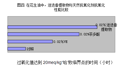 各類天然抗氧化劑與迷迭香抗氧化劑在植物油脂中使用比較,它們抗氧化性能的順序為:迷迭香提取物>茶多酚>維生素E。(見圖四)