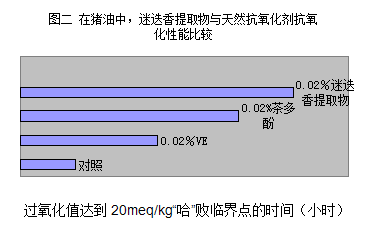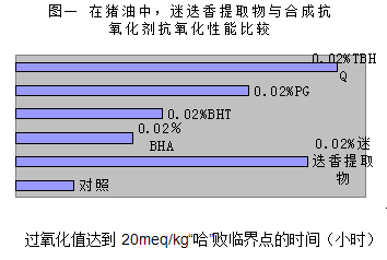 各類合成抗氧化劑與迷迭香抗氧化劑在動物油脂中使用比較,它們抗氧化性能的順序為:迷迭香提取物>PG>BHT> BHA,迷迭香提取物與TBHQ相當。(見圖一)